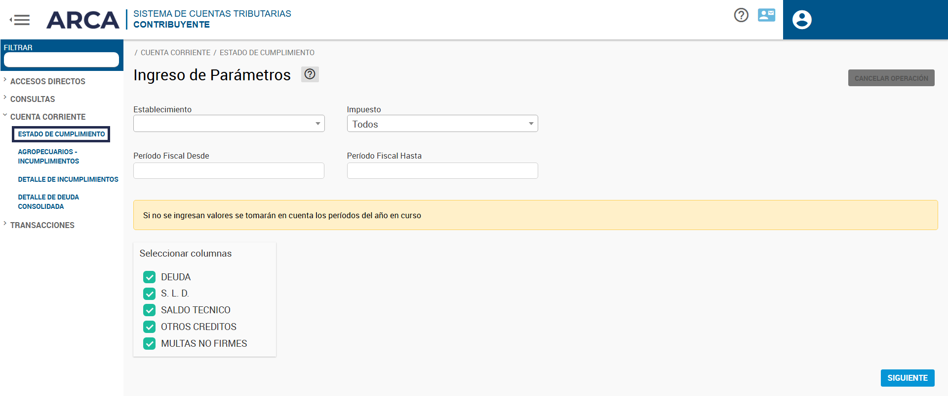 Para conocer tu situación, podés ingresar con tu clave fiscal al Sistema de Cuentas Tributarias. Dentro de la opción “Cuenta Corriente” que se observa en el menú lateral izquierdo, seleccioná la opción “Estado de cumplimiento”.